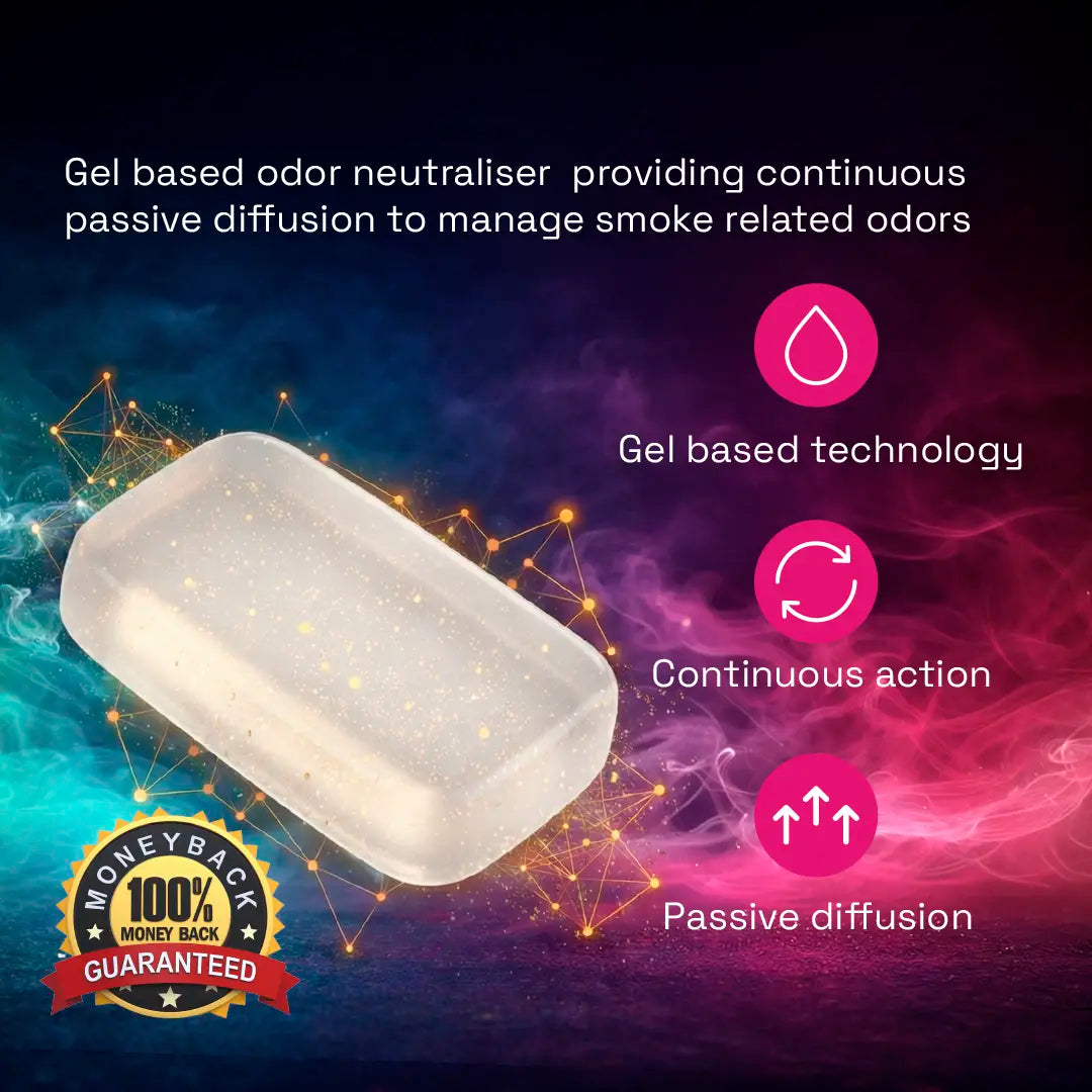 Advanced gel technology designed to eliminate tobacco and herbal smoke odours at the source. Acting at a molecular level, it targets and neutralises odour particles in the air instead of masking them, delivering real, long lasting freshness through continuous passive diffusion.
